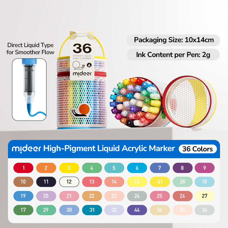 Markery akrylowe płynne z pędzelkową końcówką mideer – 36 kolorów w tubie