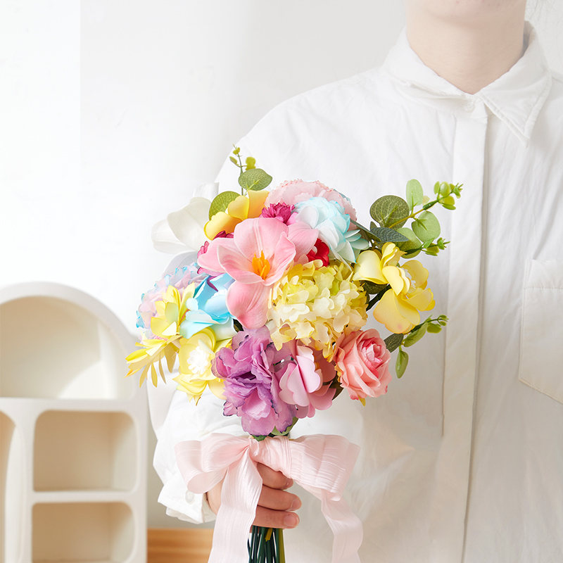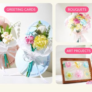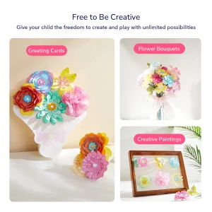 Cała zabawa polega na składaniu bibułowych szablonów kwiatów, nasączaniu ich barwnikami i układaniu własnych kompozycji w dołączonym papierowym wazonie, co daje efekt małej domowej pracowni florystycznej.